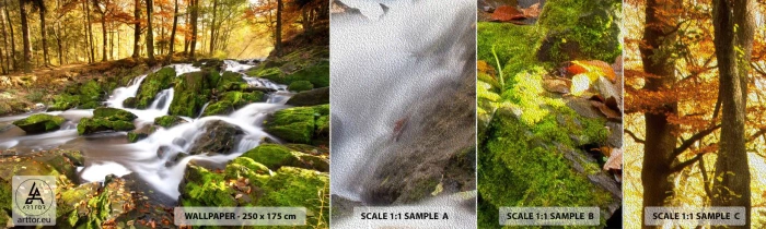 Photo Wallpaper Sample Premium Sand - Gingerly through an Autumnal Forest - Landscape, Forest, Mountain stream - 100x30 cm