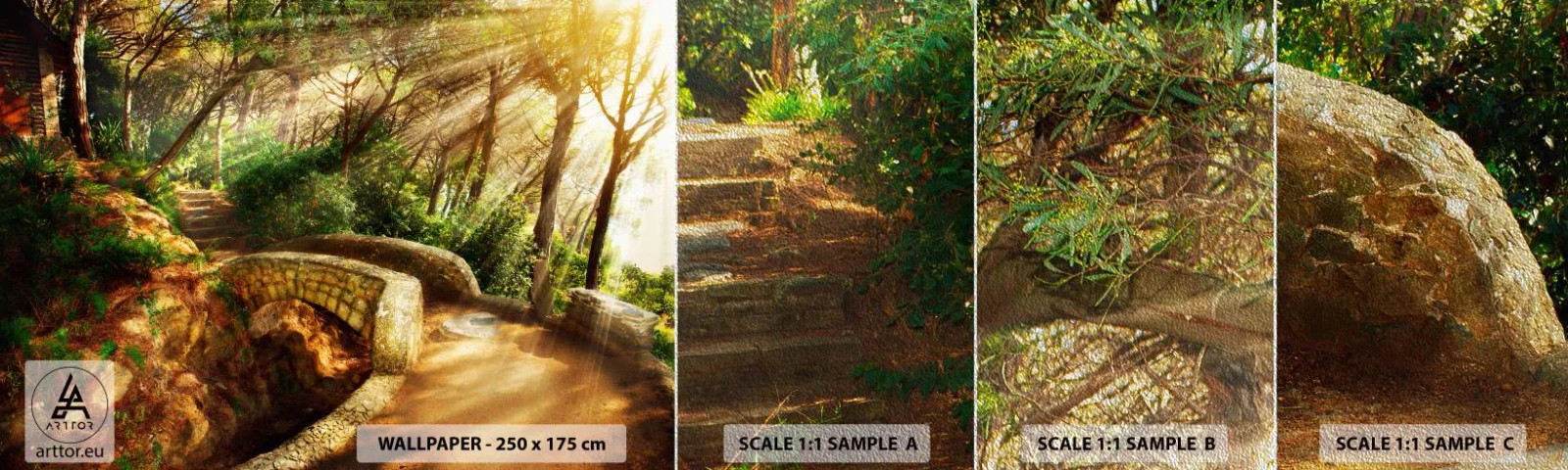 Photo Wallpaper Sample Premium Sand - From the Bridge to Enchanted Forest - Landscapes, Stone Stairs, Rays of the sun - 100x30 cm