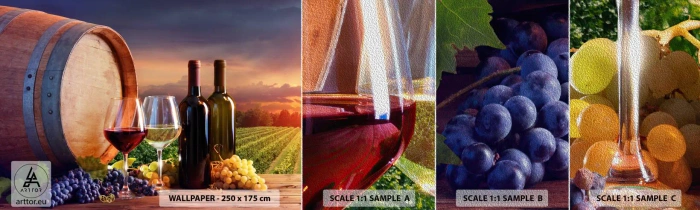 Photo Wallpaper Sample Premium Sand - Here Life Is Full of Flavour - Vineyard, Wine Barrel, Grape - 100x30 cm