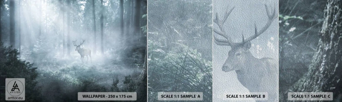 Photo Wallpaper Sample Premium Sand - Morning Round of the Estate - Landscape, Forest, Deer - 100x30 cm