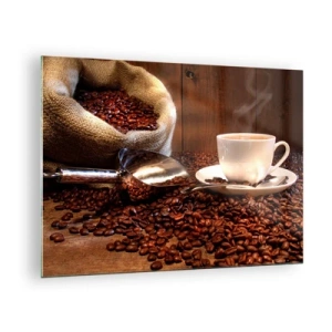 Glass picture - A cup of coffee against a background of beans and a jute bag - 70x50cm - Can You Smell It? - Modern wall decoration for the living room and bedroom ARTTOR