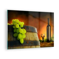 Glass picture - Grapes on a barrel in a rustic setting with wine in the background - 70x50cm - Still Life with a Bottle of Wine and a Bunch of Grapes - Modern wall decoration for the living room and bedroom ARTTOR