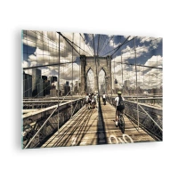 Glass picture - The Brooklyn Bridge on a sunny day with pedestrians and cyclists - 70x50cm - Straight to the Heart of the City - Modern wall decoration for the living room and bedroom ARTTOR