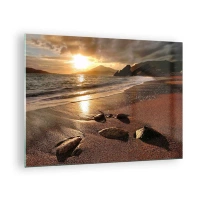 Glass picture - Sunset over a rocky beach and hills - 70x50cm - Follow the Sun towards Hills - Modern wall decoration for the living room and bedroom ARTTOR