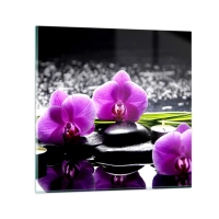 Wall clock - Clock on glass - Purple orchids with stones and a candle on the water - 30x30cm - Drowning in Peace and Quiet - Modern wall decoration for the living room, kitchen, and bedroom ARTTOR