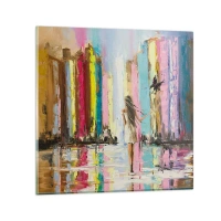 Wall clock - Clock on glass - A woman in a white dress in a colorful urban setting - 30x30cm - Follow Me - Modern wall decoration for the living room, kitchen, and bedroom ARTTOR