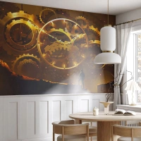 Photo Wallpaper Standard Eco - Golden clockwork mechanisms with a figure in the background in a steampunk style - 100x70cm - At the Beginning of Time - Modern wall decoration for the living room and bedroom ARTTOR
