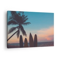 Canvas picture - Surfboards against the backdrop of a palm tree and a sunset - 70x50cm - Tomorrow Will Be Fun Too - Modern wall decoration for the living room and bedroom ARTTOR