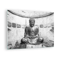 Glass picture - Black and white statue of Buddha in a meditative pose - 70x50cm - At the Source of Peace - Modern wall decoration for the living room and bedroom ARTTOR