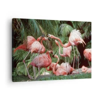 Canvas picture - A group of flamingos in a tropical setting surrounded by palm trees - 70x50cm - Afternoon Gossip - Modern wall decoration for the living room and bedroom ARTTOR