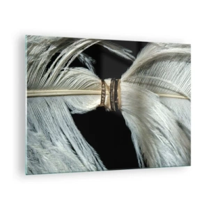 Glass picture - Close-up of wedding rings on white feathers against a black background - 70x50cm - …and I won't Leave You… - Modern wall decoration for the living room and bedroom ARTTOR