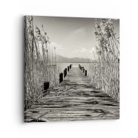 Canvas picture - A wooden jetty among tall grasses over a sepia-toned lake - 70x50cm - In the Grass - Modern wall decoration for the living room and bedroom ARTTOR