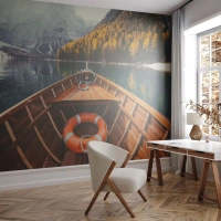 Photo Wallpaper Standard Eco - View from a wooden boat of a lake surrounded by mountains and forest - 100x70cm - Mountain Hike - Modern wall decoration for the living room and bedroom ARTTOR