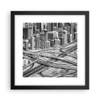 Wall clock - Clock on glass - A black and white photo of a city with a dense network of highways. - 30x30cm - Dubai - Impossible City - Modern wall decoration for the living room, kitchen, and bedroom ARTTOR