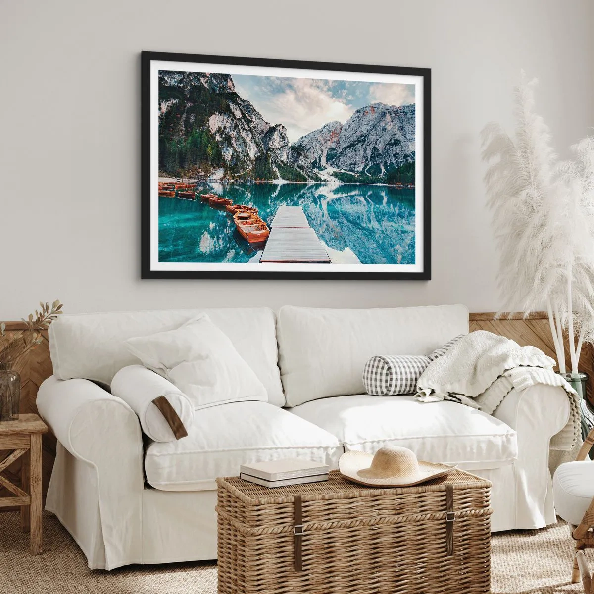 Poster in black frame - A mountain lake with wooden boats and a pier - 50x70cm - We Will Show You Beauty - Modern wall decoration for the living room and bedroom ARTTOR