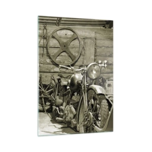 Poster in black frame - An old motorcycle in a wooden shed with a wheel in the background - 50x70cm - In Grandad's Shed - Modern wall decoration for the living room and bedroom ARTTOR