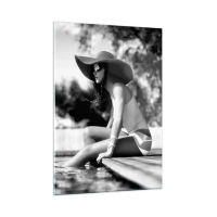 Poster in black frame - A black and white photograph of a woman wearing a hat sitting by the water. - 50x70cm - Summer Dream - Modern wall decoration for the living room and bedroom ARTTOR
