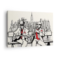 Canvas picture - A jazz duo with saxophone and guitar against the backdrop of the city - 70x50cm - New York Improvisation - Modern wall decoration for the living room and bedroom ARTTOR