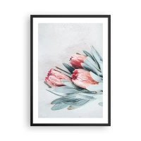 Poster in black frame - A subtle composition of protea flowers on a light background - 50x70cm - Ashamed of Their Own Beauty - Modern wall decoration for the living room and bedroom ARTTOR