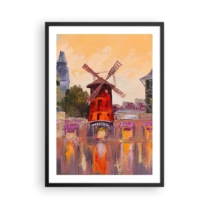 Poster in black frame - A painterly interpretation of the famous windmill against the backdrop of the city - 50x70cm - Icons of Paris - Moulin Rouge - Modern wall decoration for the living room and bedroom ARTTOR