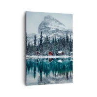 Poster in black frame - Winter landscape with cottages by the lake and a mountain in the background - 50x70cm - Canadian Retreat - Modern wall decoration for the living room and bedroom ARTTOR