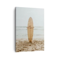 Poster in black frame - person holding a surfboard on a beach, overlooking the sea. - 50x70cm - From Love for the Waves - Modern wall decoration for the living room and bedroom ARTTOR