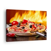 Canvas picture - Pizza with olives, tomatoes and peppers against a background of flames - 70x50cm - From Italy with Love - Modern wall decoration for the living room and bedroom ARTTOR