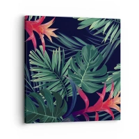 Canvas picture - Tropical leaves and flowers on a dark background - 70x50cm - Burn in Green - Modern wall decoration for the living room and bedroom ARTTOR