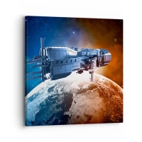Glass picture - A spaceship orbiting a planet in starlight - 70x50cm - Careful Observer - Modern wall decoration for the living room and bedroom ARTTOR