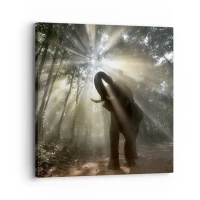 Canvas picture - An elephant in the forest surrounded by rays of light in the morning mist - 70x50cm - Under a Lucky Star - Modern wall decoration for the living room and bedroom ARTTOR