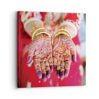 Glass picture - Hennaed hands in traditional attire against a red background - 70x50cm - Readt to Catch Happiness - Modern wall decoration for the living room and bedroom ARTTOR