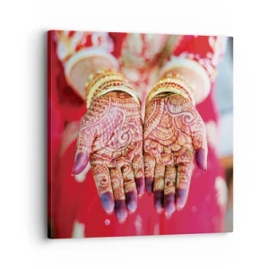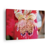 Canvas picture - Hands decorated with henna against the background of a red dress - 70x50cm - Readt to Catch Happiness - Modern wall decoration for the living room and bedroom ARTTOR