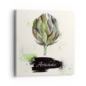 Canvas picture - Watercolor artichoke with text on a light background with green accents - 70x50cm - Eviva Vegetables! - Modern wall decoration for the living room and bedroom ARTTOR